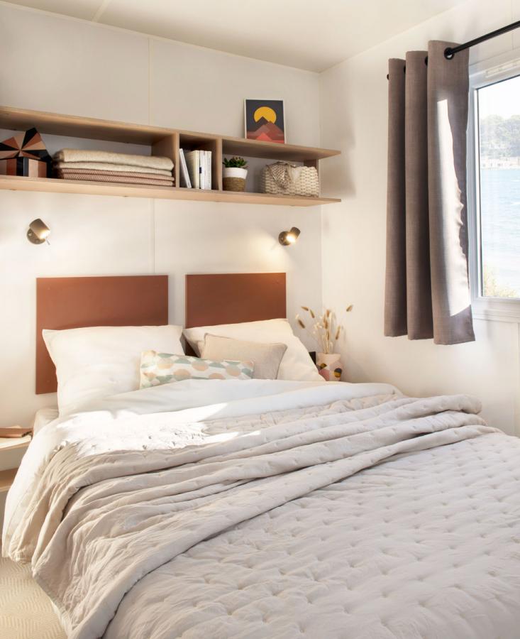 - Volwassenen slaapkamer met 1 bed van 160 x 200 cm, kussens en pooldeken, 1 kledingkast en opslagplanken.